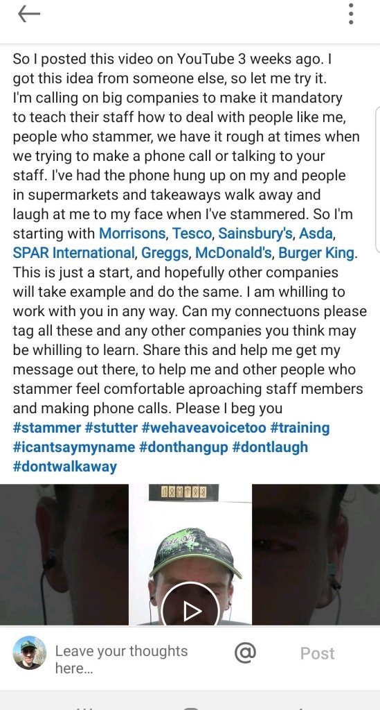 I’ve also taken another step in getting companies to achnowledge people like me with a stammer, I’ve posted on LinkedIn and twitter and started off with Morrison’s, Tesco, Sainsbury’s, McDonalds, burger king, KFC and greggs. I tagged them and asked my followers on them sites to tag them and any other company to help with them training their staff.