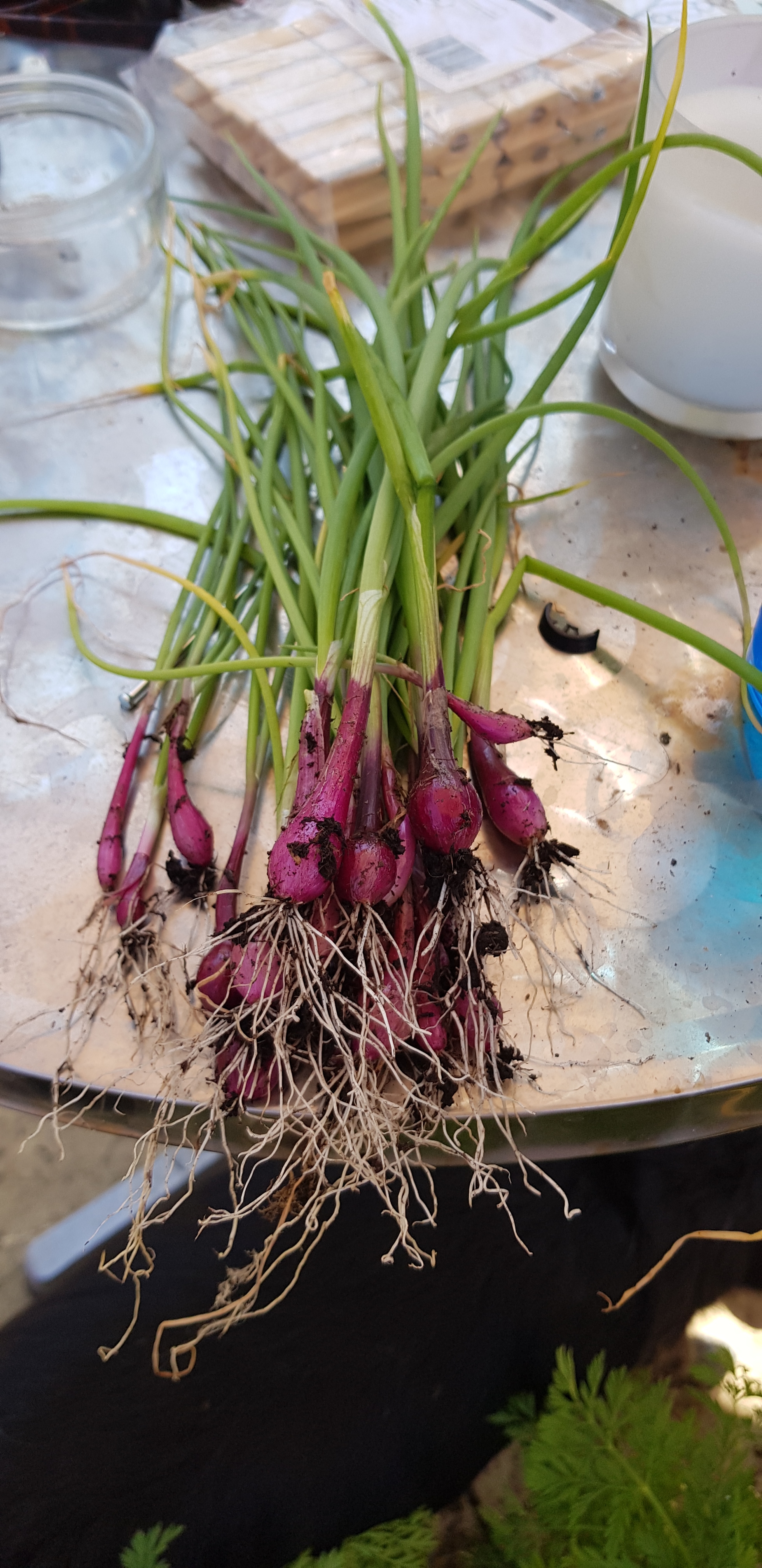 Potatoes, carrots, spring onions and beetroot. It was fun to get them done but didn’t get as much as we wanted but the carrots were just thinned out so we still got them growing.