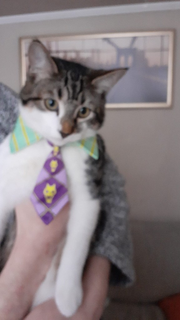 He got a new “suit” tie, and he loves it. He’s so chilled out I’ve never known a puddy like him. Smudge has given me some amazing company, and helped keep anxiety levels low.